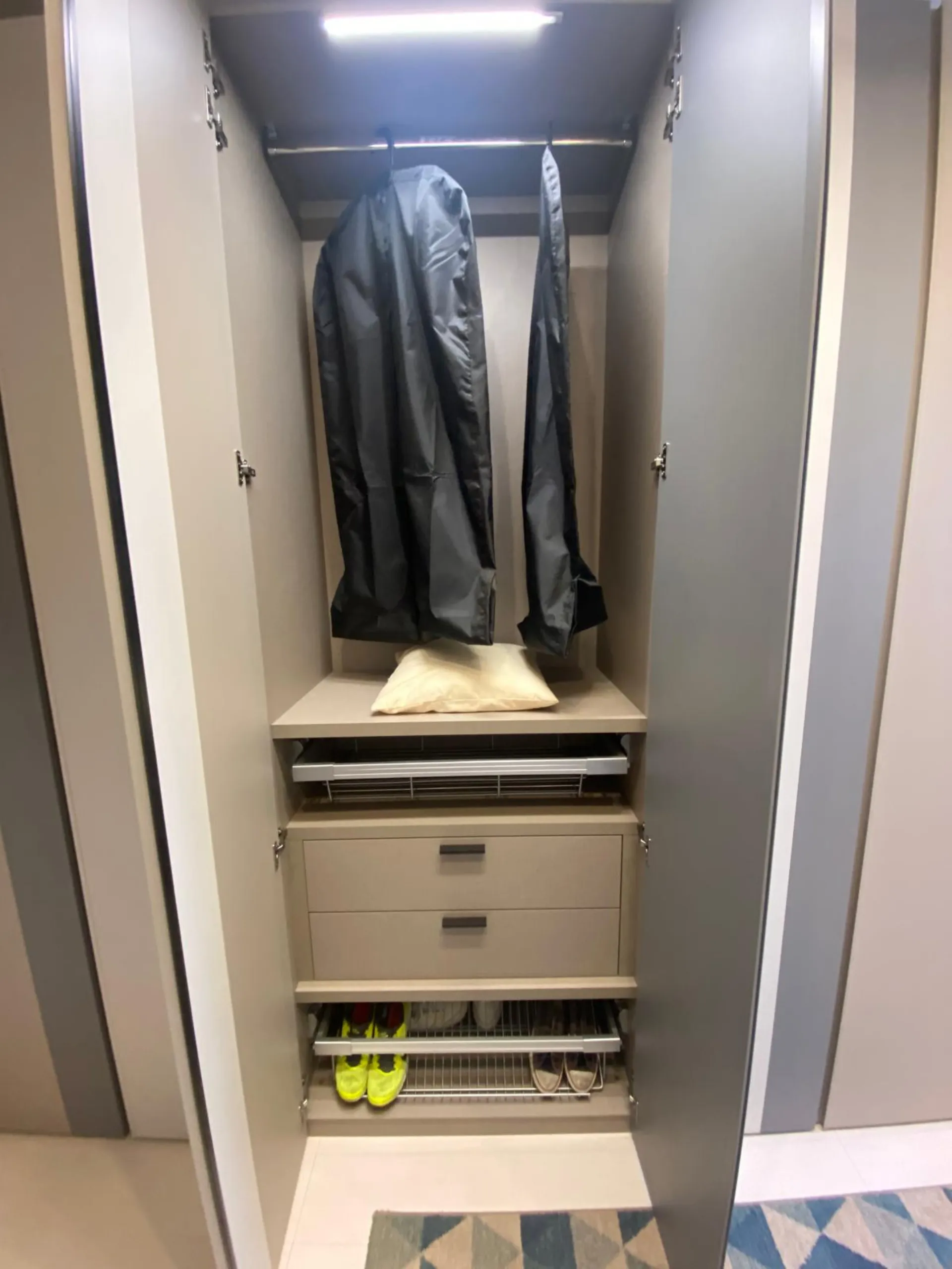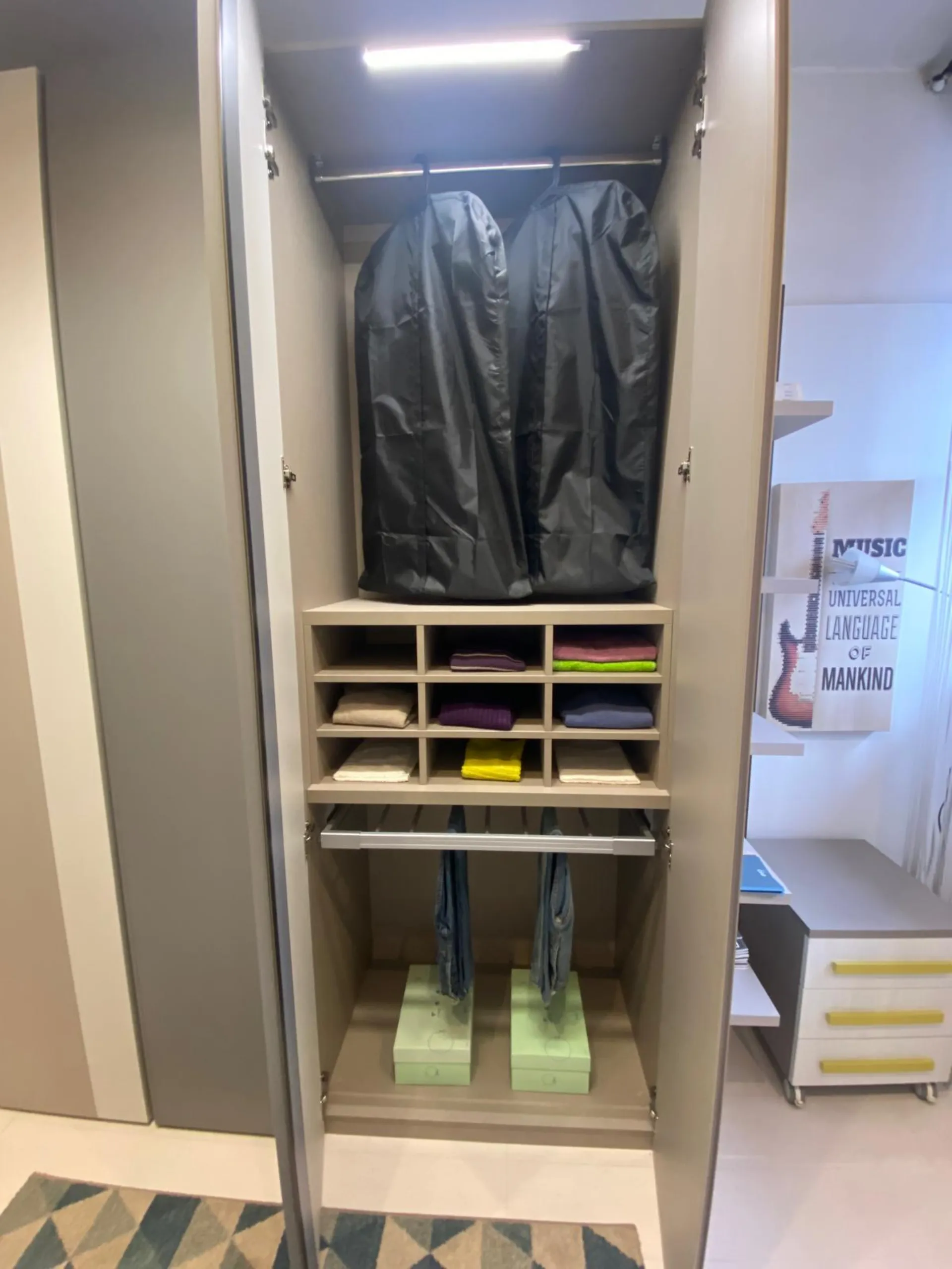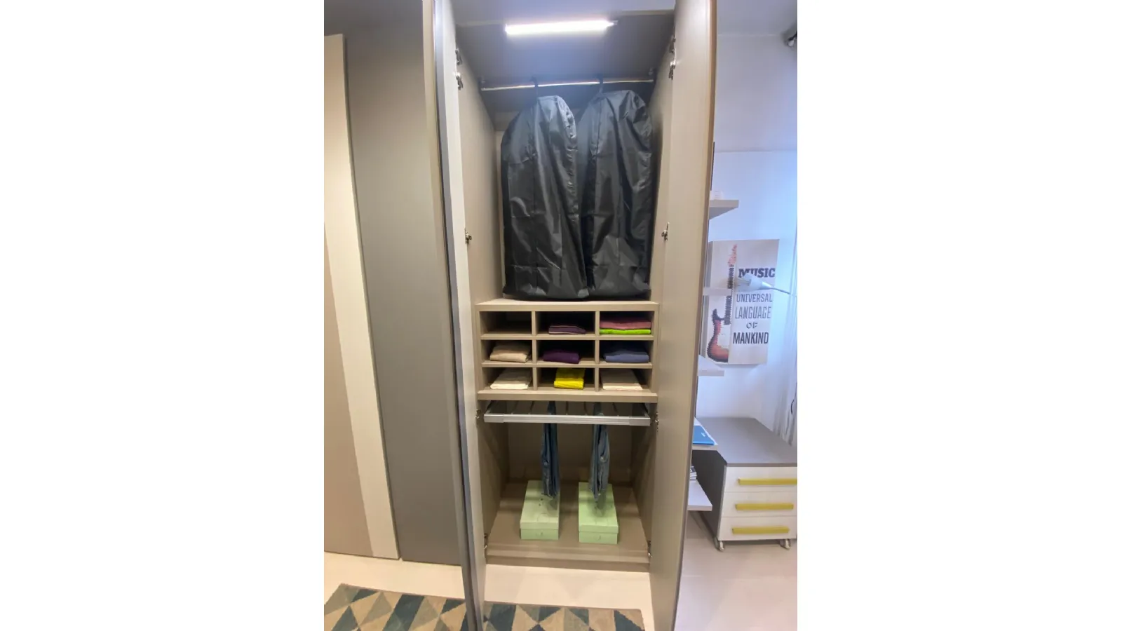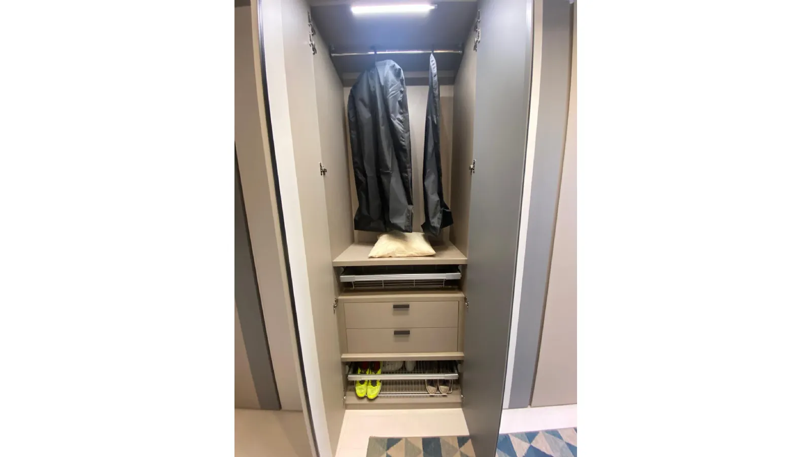 Armadio Terna di Orme design con apertura a gola in tinta tortora,seta e grigio L.280 cm + laterale con mensole L.28cm. Completo accessori interni con portapantaloni estraibile, raster porta maglie, portascarpe estraibile, cassettiera 2 cassetti, servetto, divisore con ripiani e appendini. Led superiori con sensore. In prezzo Outlet a € 1850,00. Visionabile previo appuntamento nel punto vendita di Caselle t.se in Via alle Fabbriche 20. Tel . 0118170952.