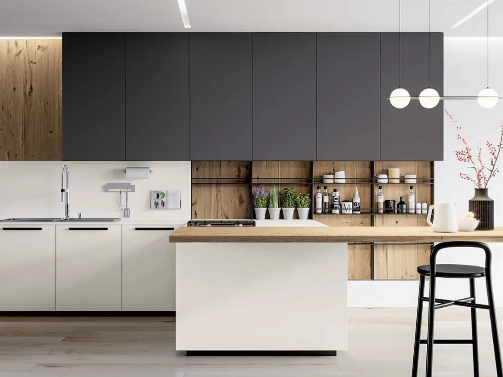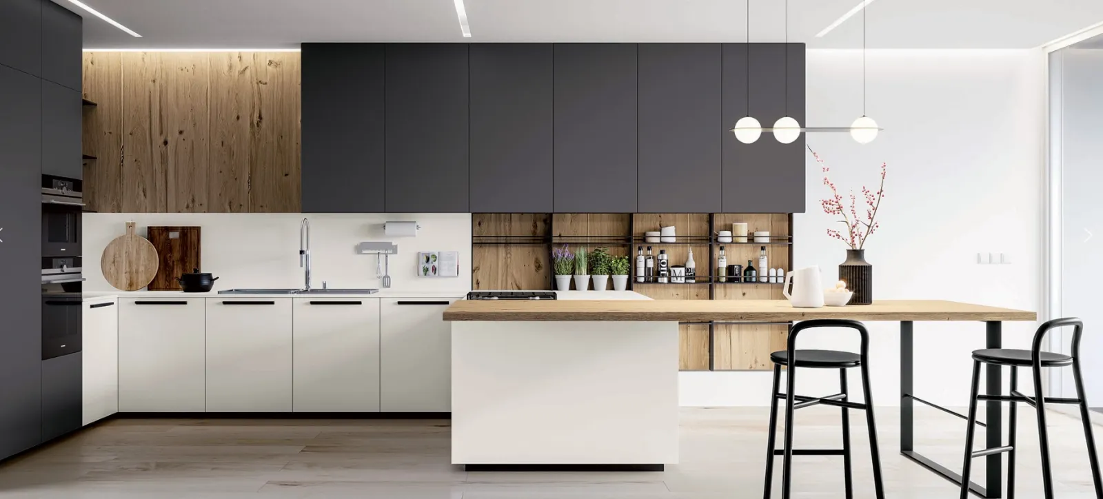 La Cucina Creo Kitchens GRUPPO LUBE è un meraviglioso esempio di design e funzionalità. Realizzata con laminato materico, questa cucina presenta un affascinante effetto cemento grigio ardesia e bianco, con un top in laminato h 2 cm luserna. Il bancone snack è impiallacciato in rovere naturale con uno spessore di 4 cm. Le misure della parete frontale sono L. 387 cm H. 217 cm e l'isola misura 185x95. La cucina è completa di: