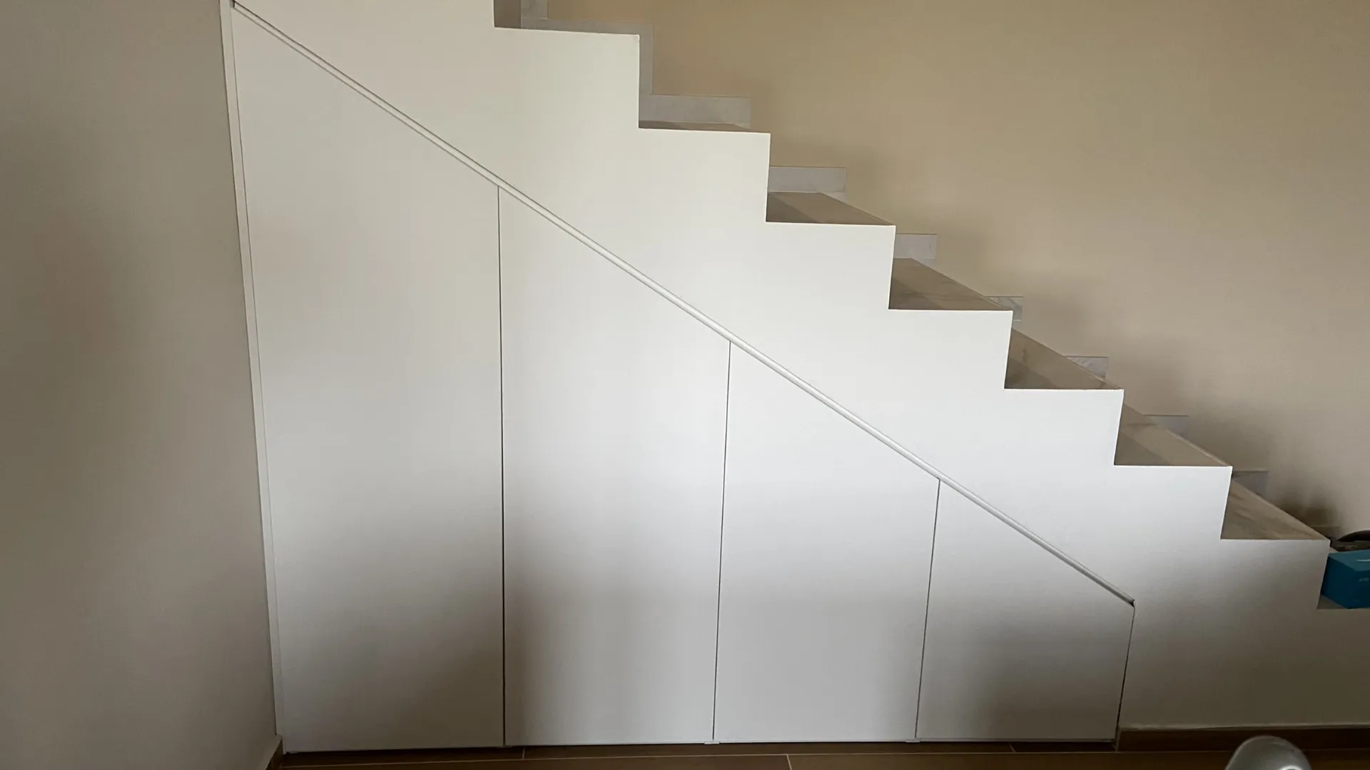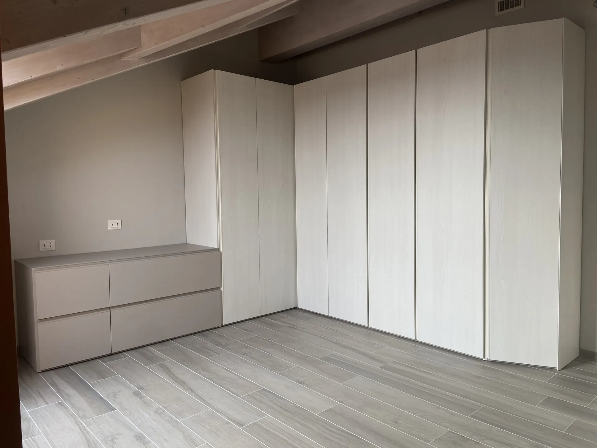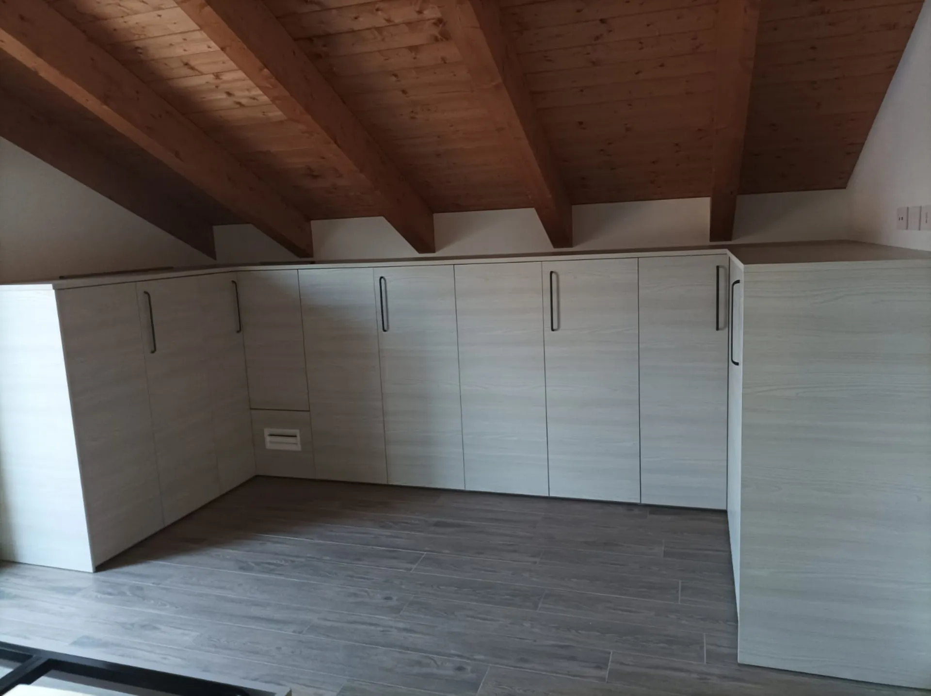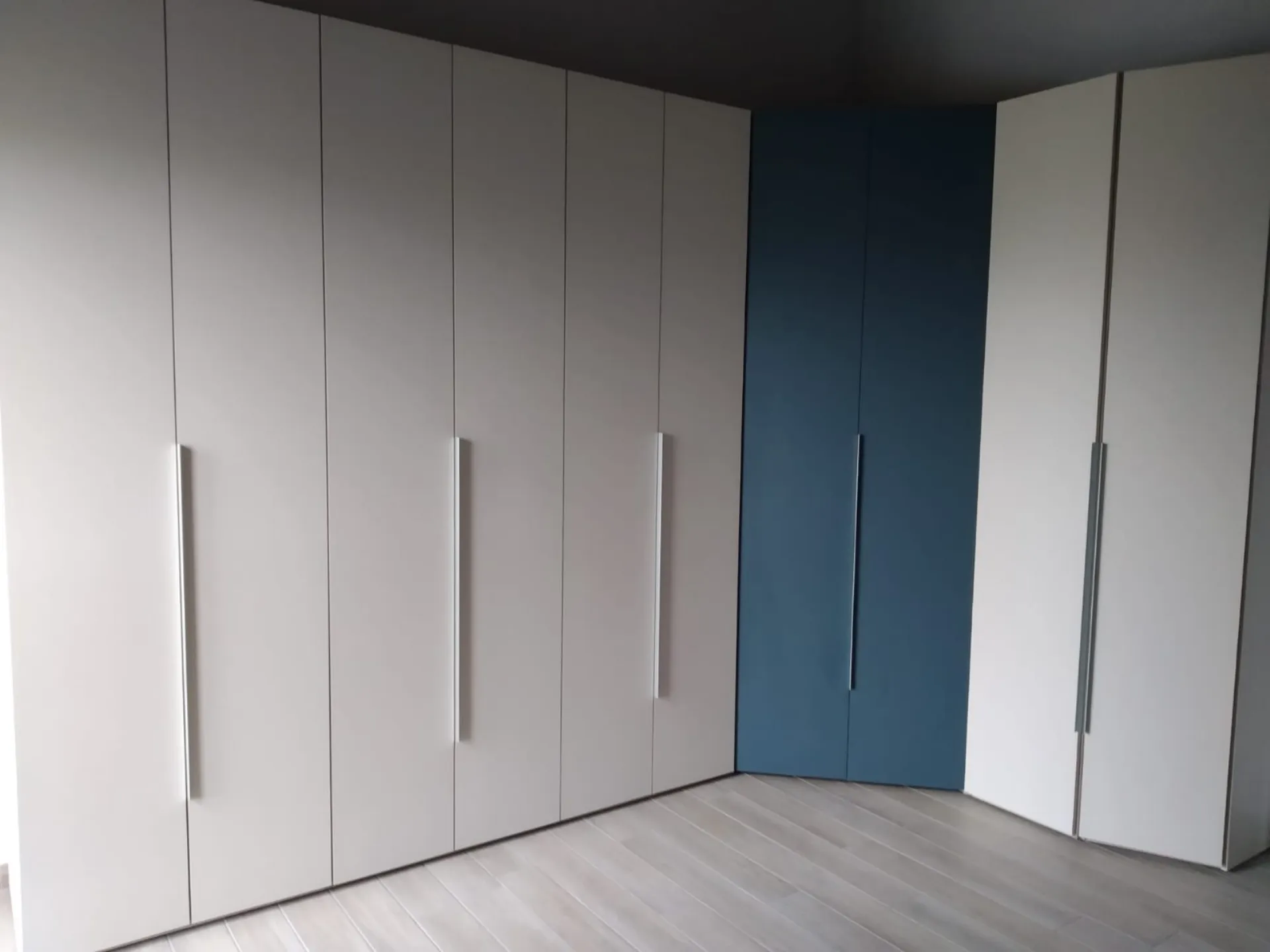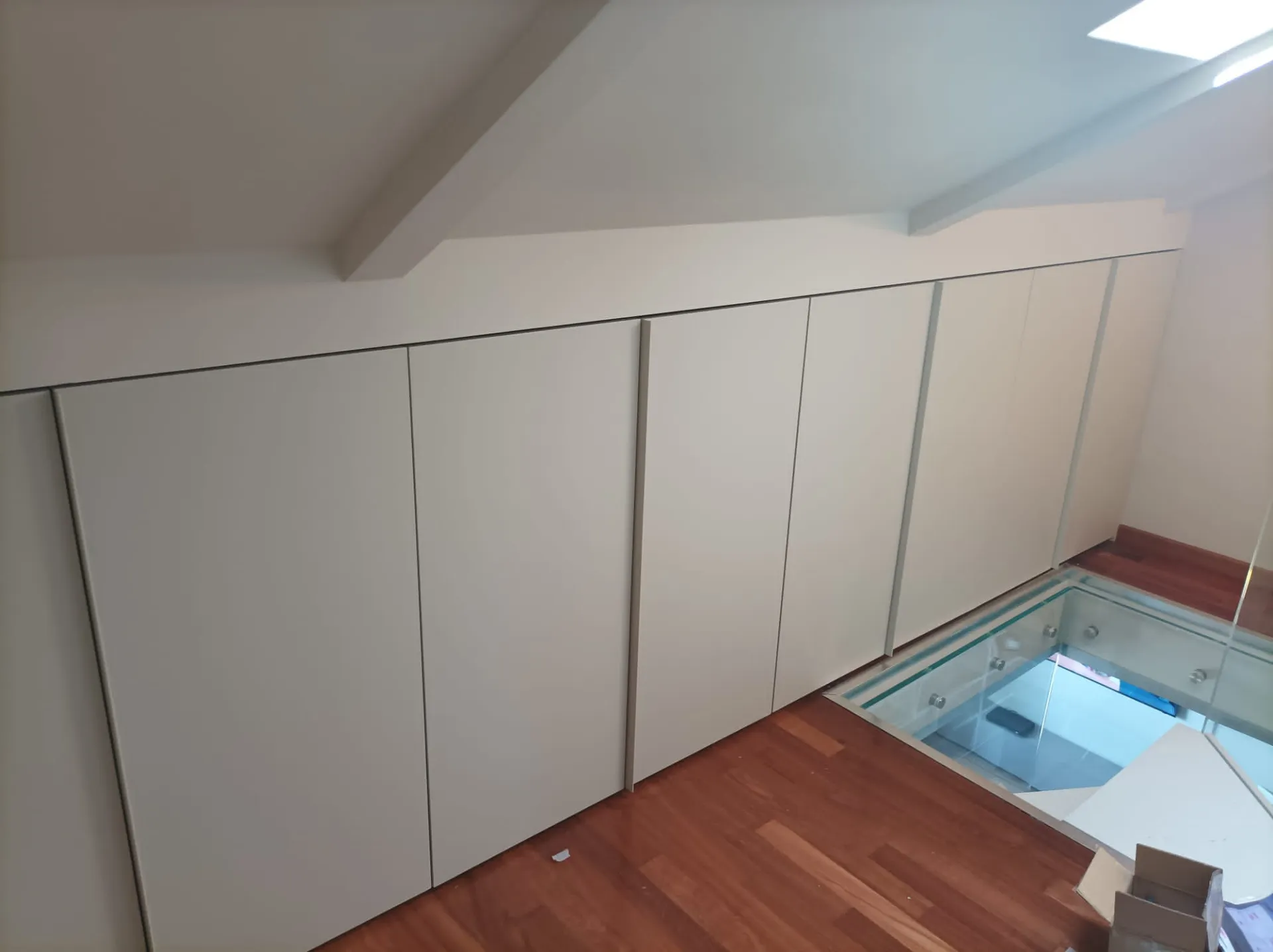 Armadiatura in laminato tortora ad angolo con cabina e terminale con aperture a gola