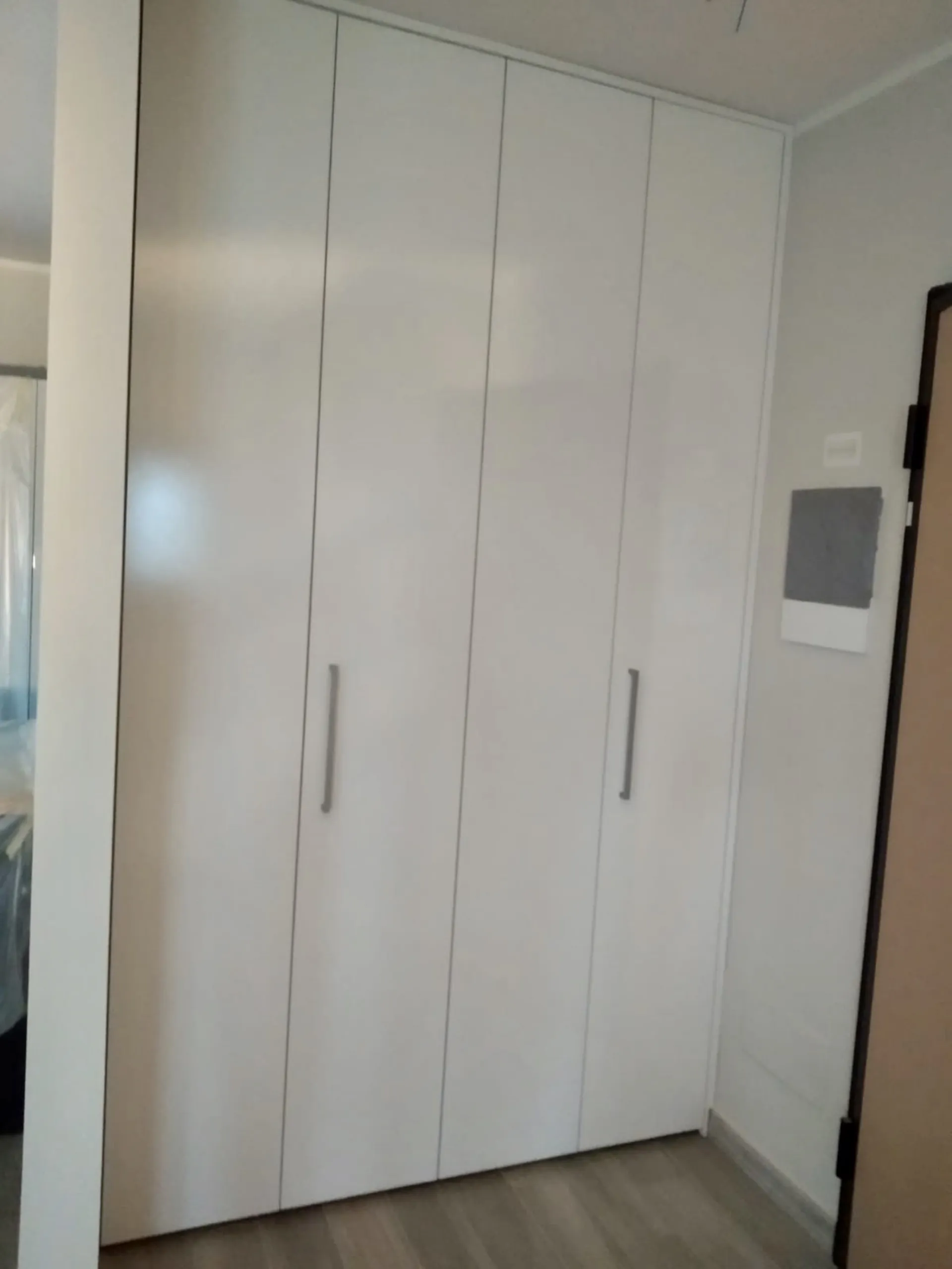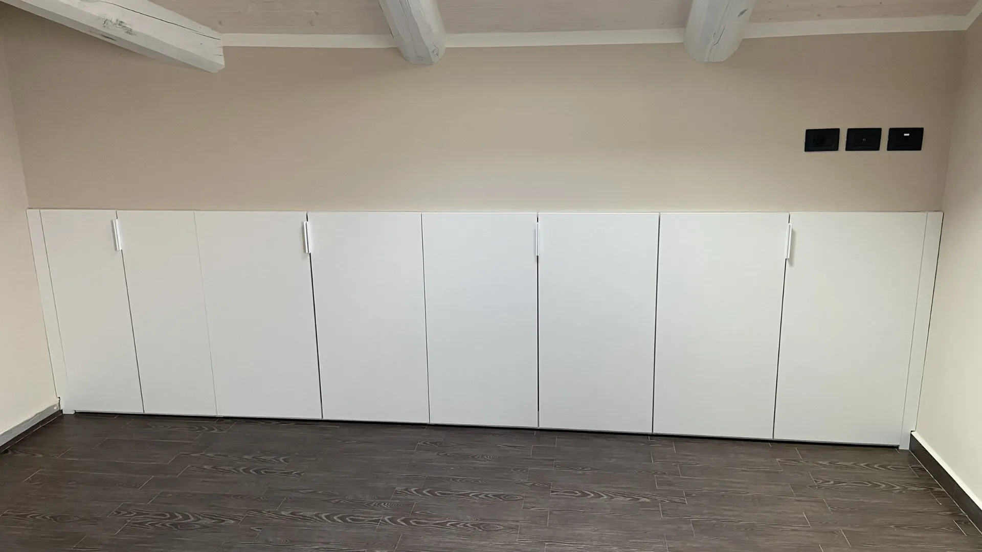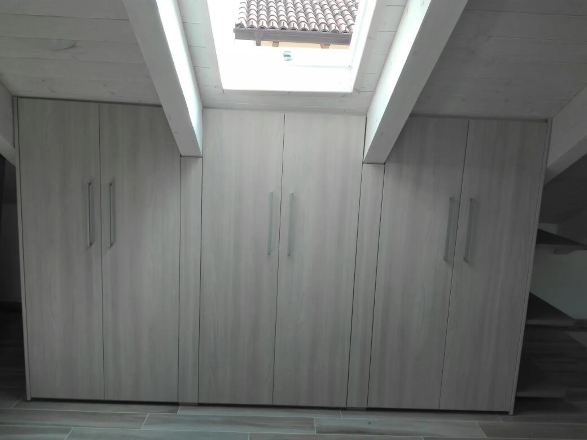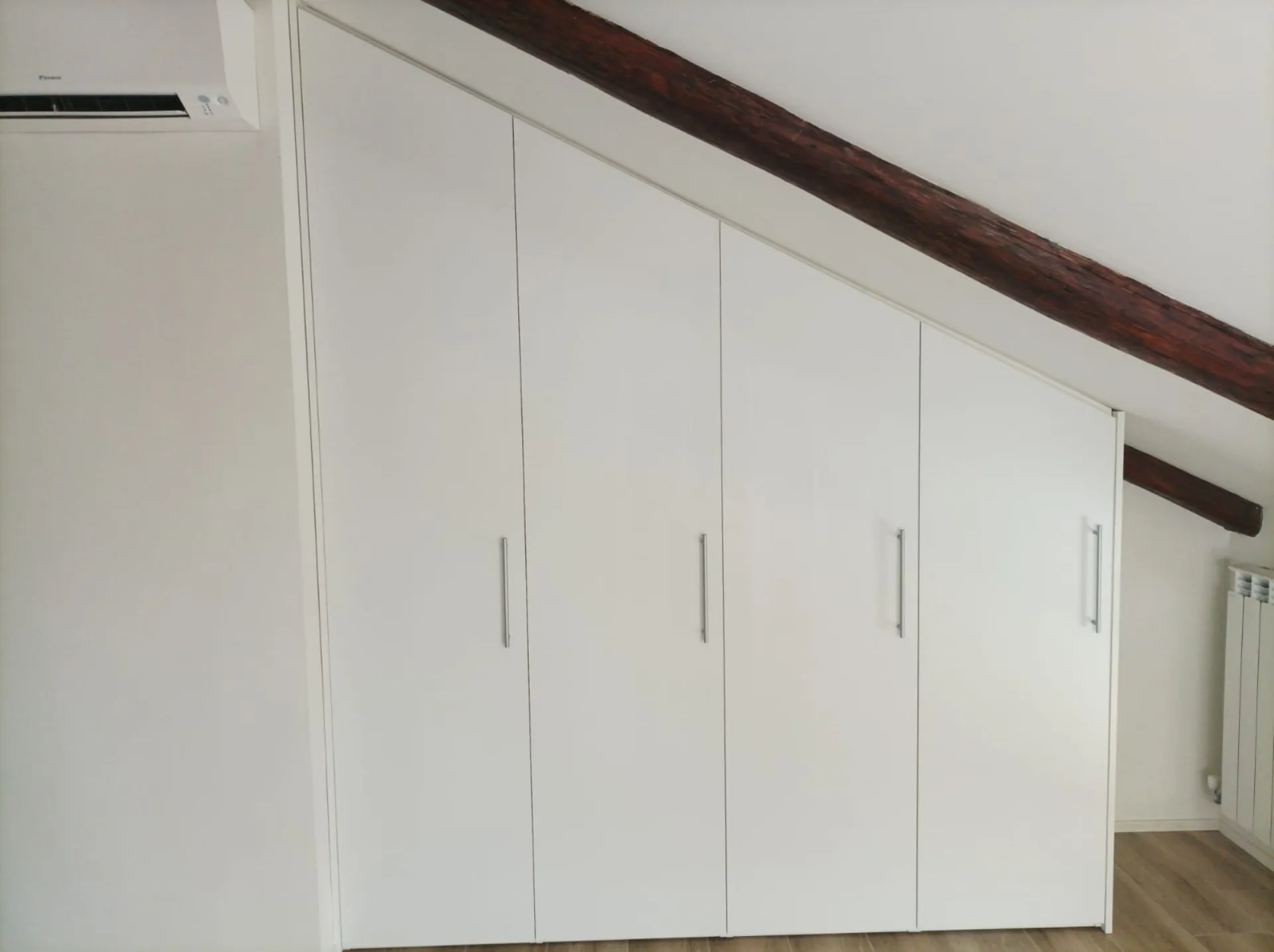 Armadio scorrevole a muro in laminato e fascia verticale tinta legno