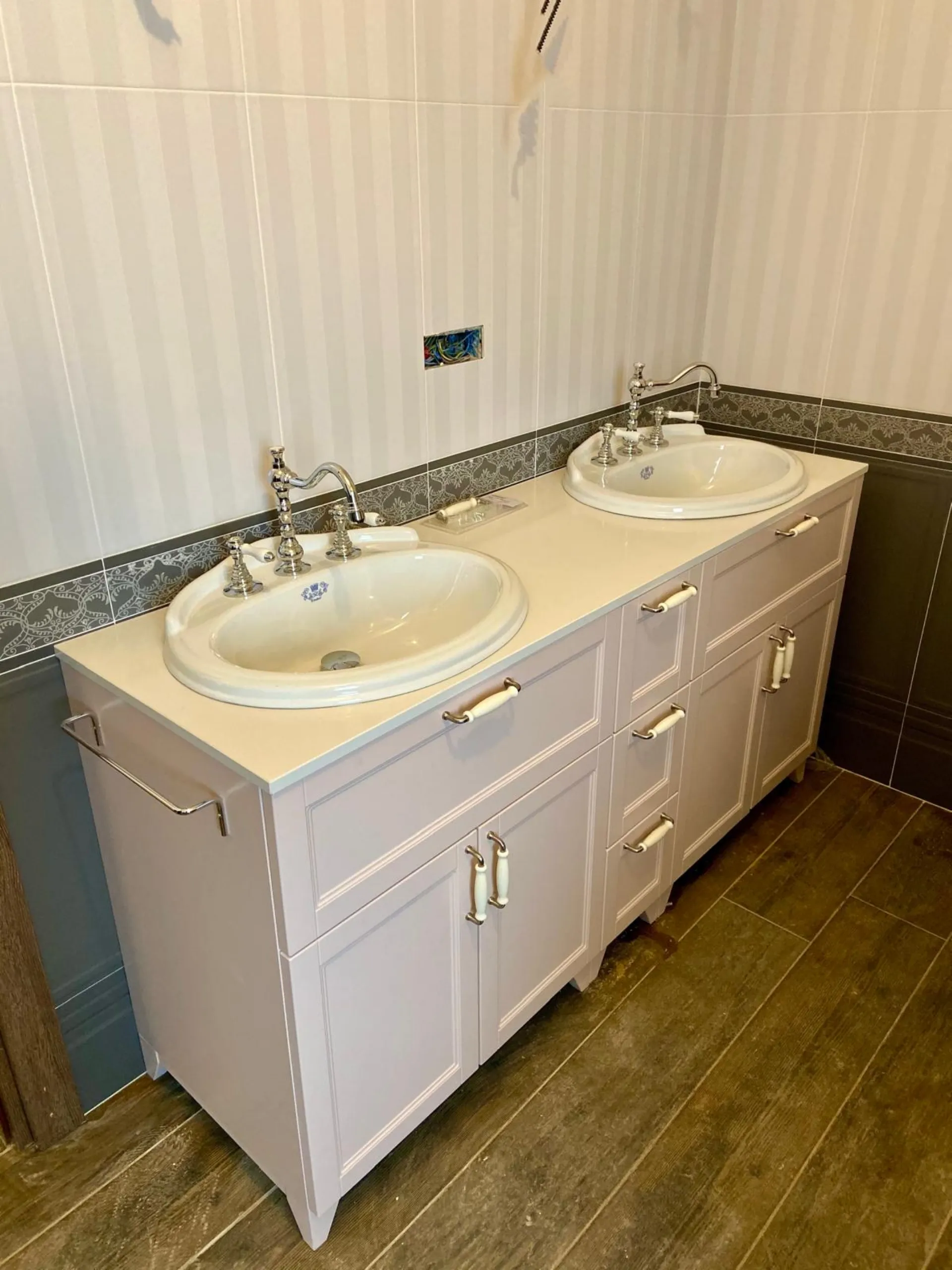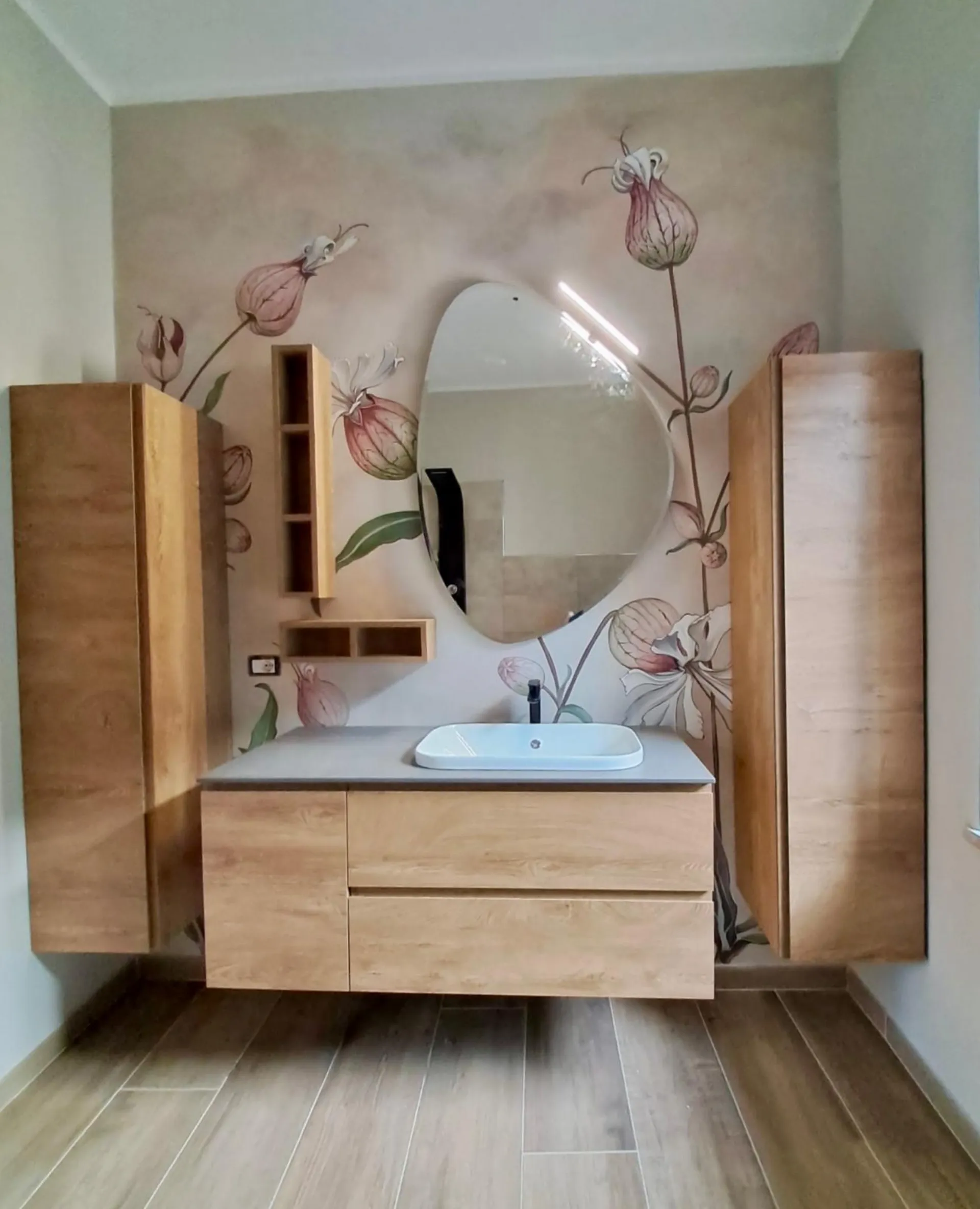 Mobile bagno su misura a muro con specchiera a tutta parete e sopralzi superiori