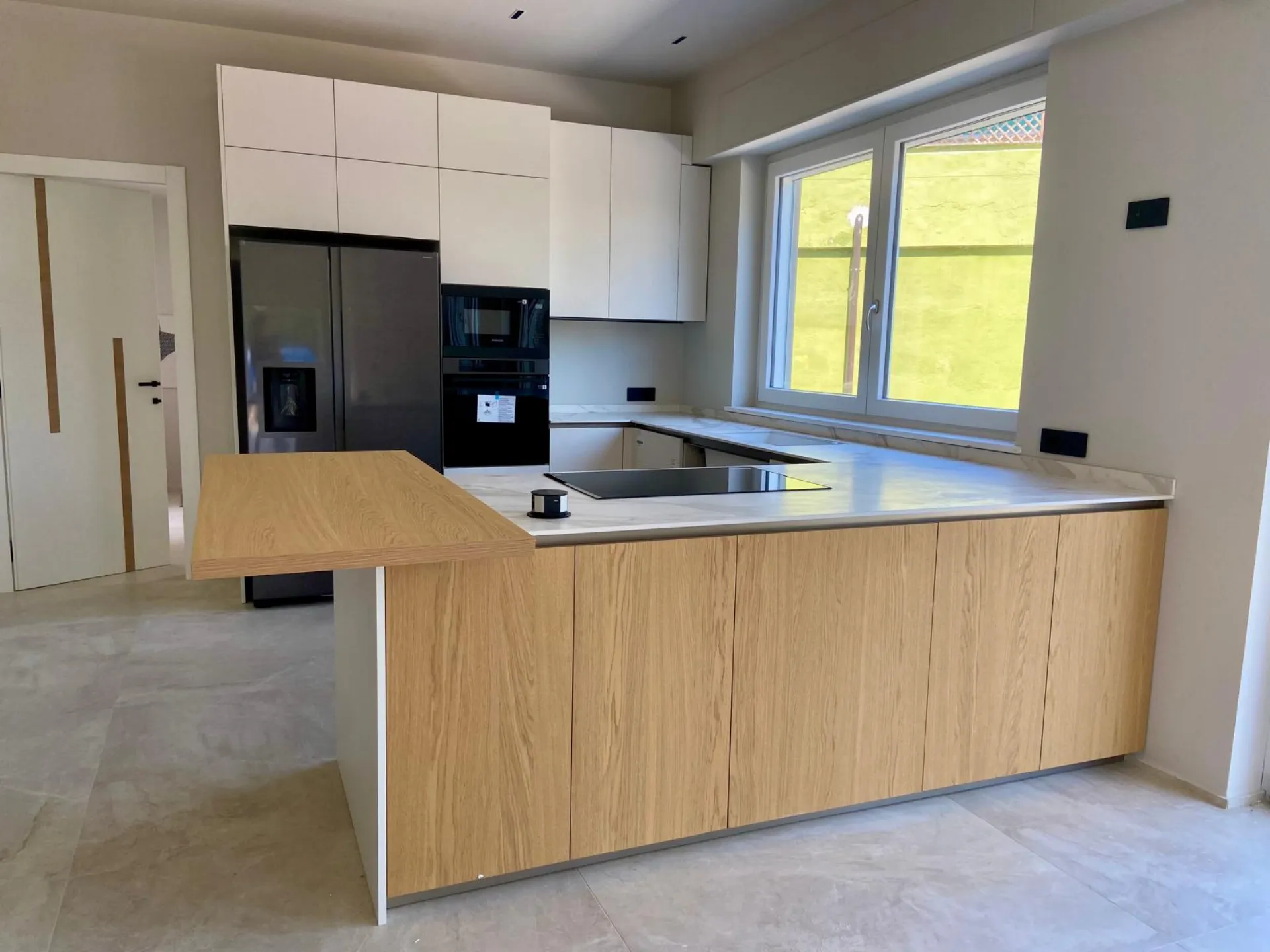 Cucina con penisola in laminato tinta desert, pensili fino a soffitto e cappa incassata a soffitto