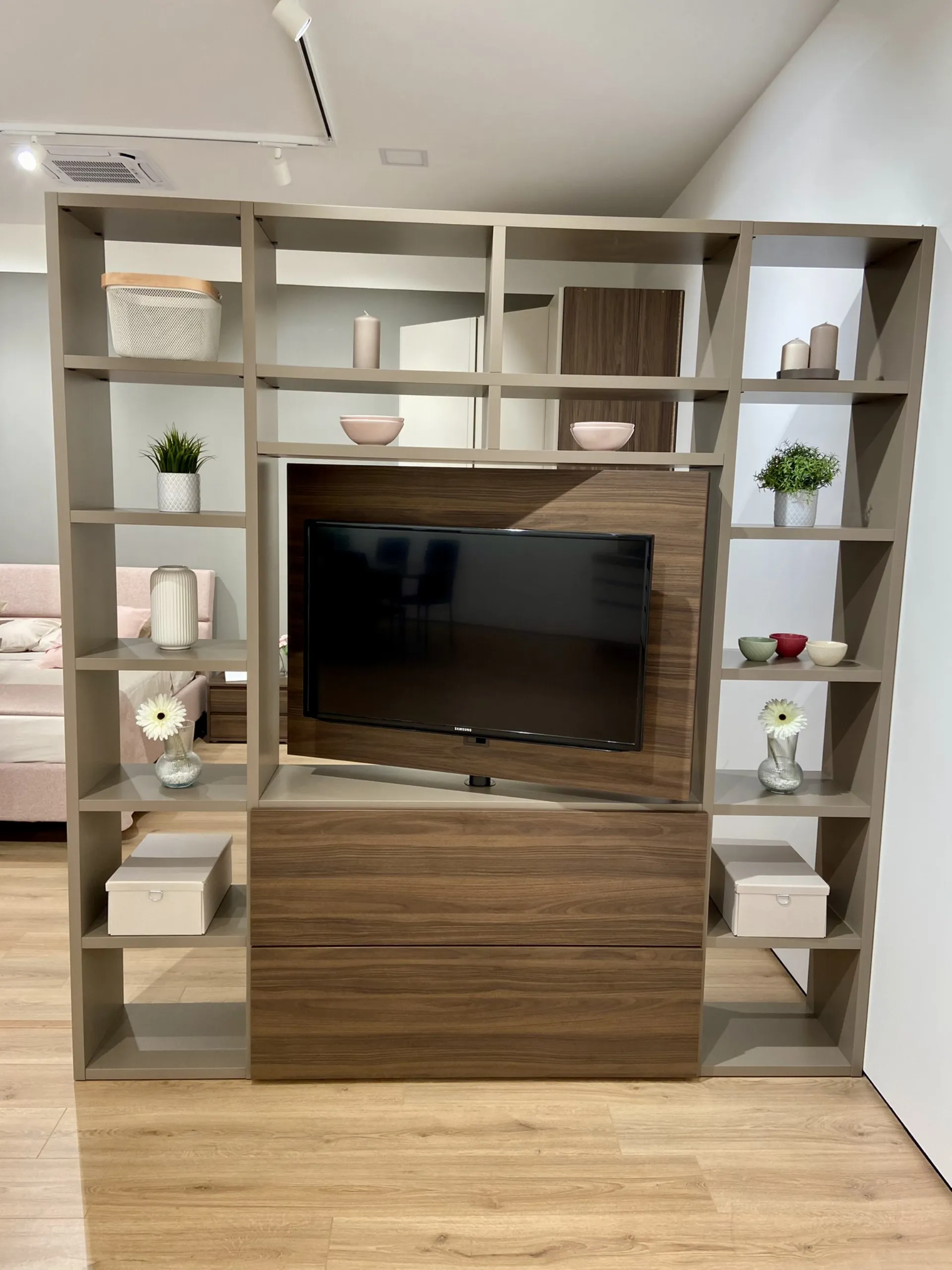 Libreria bifacciale da centro stanza con pannello centrale porta tv girevole a 360 gradi