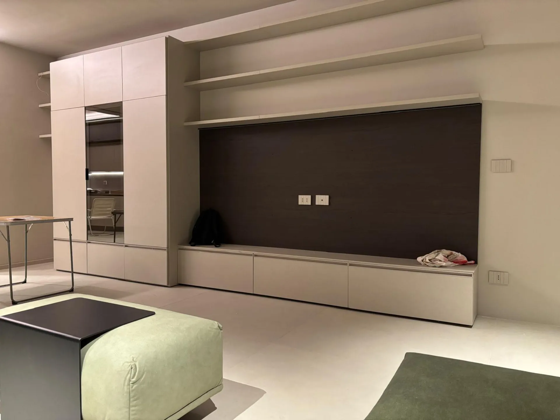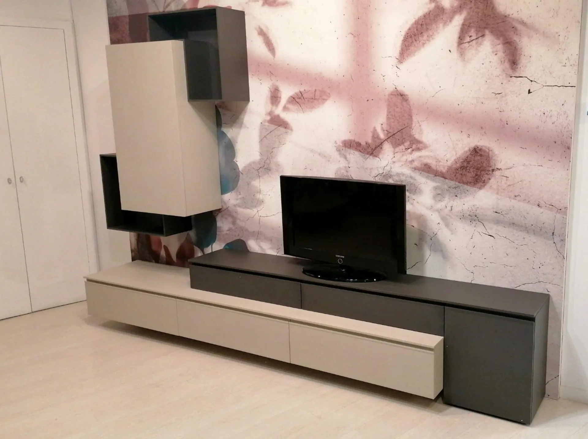 Composizione soggiorno sospesa sipario in laccato opaco e materico carbone