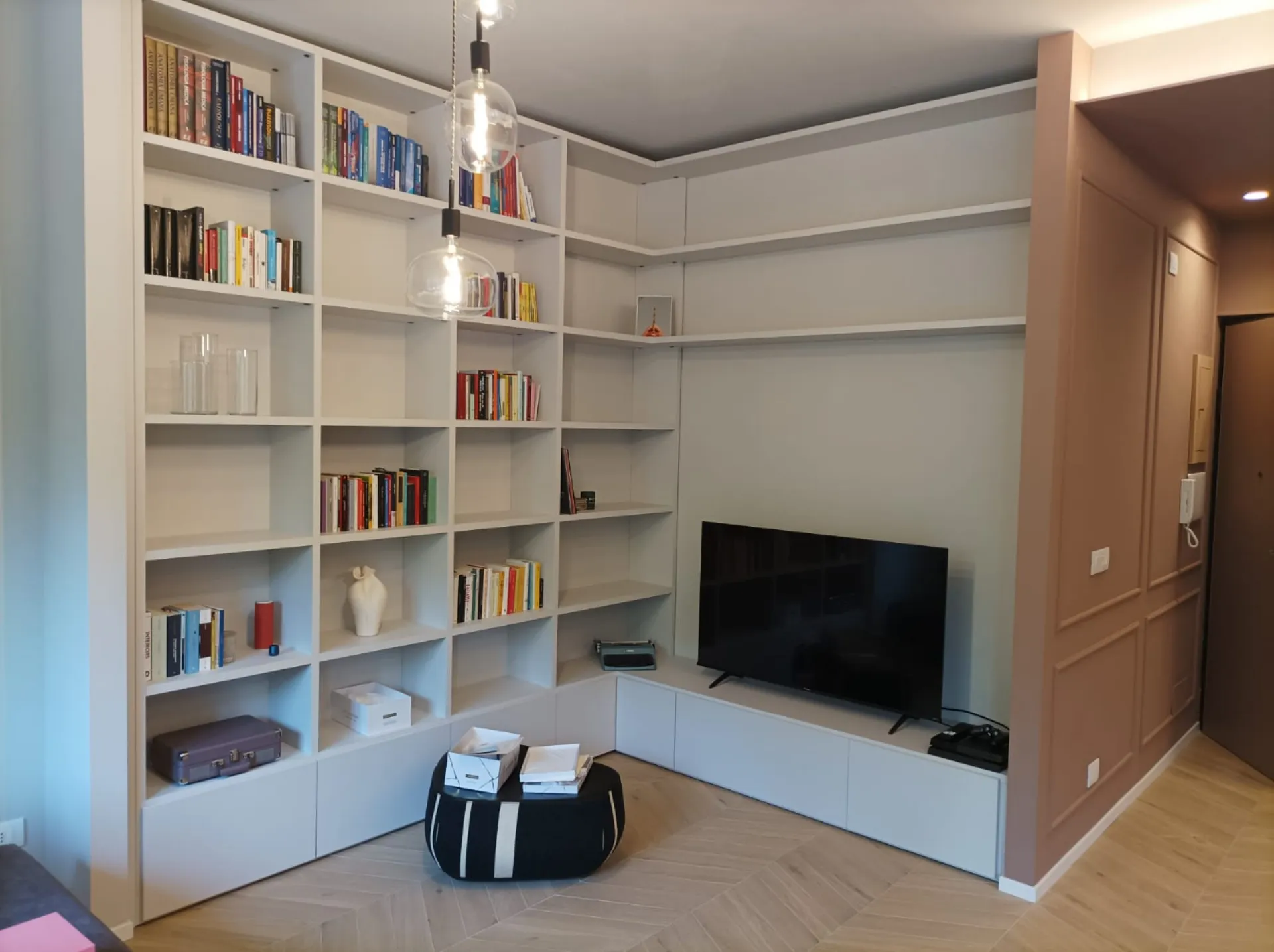 Composizione soggiorno con libreria integrata e pannello a muro retro tv