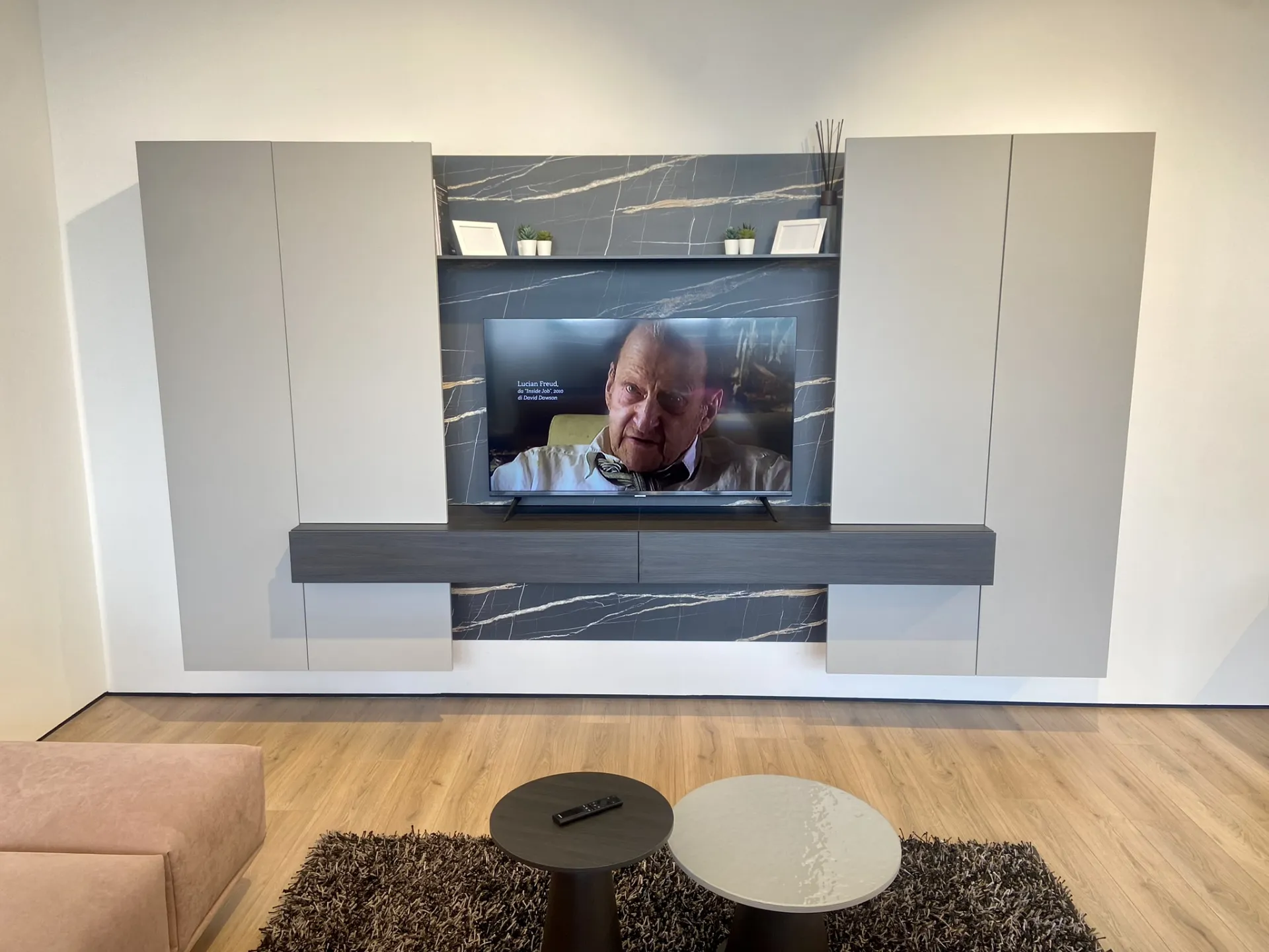 Parete soggiorno con libreria integrata in laminato tortora e laccato opaco con ante cannettate