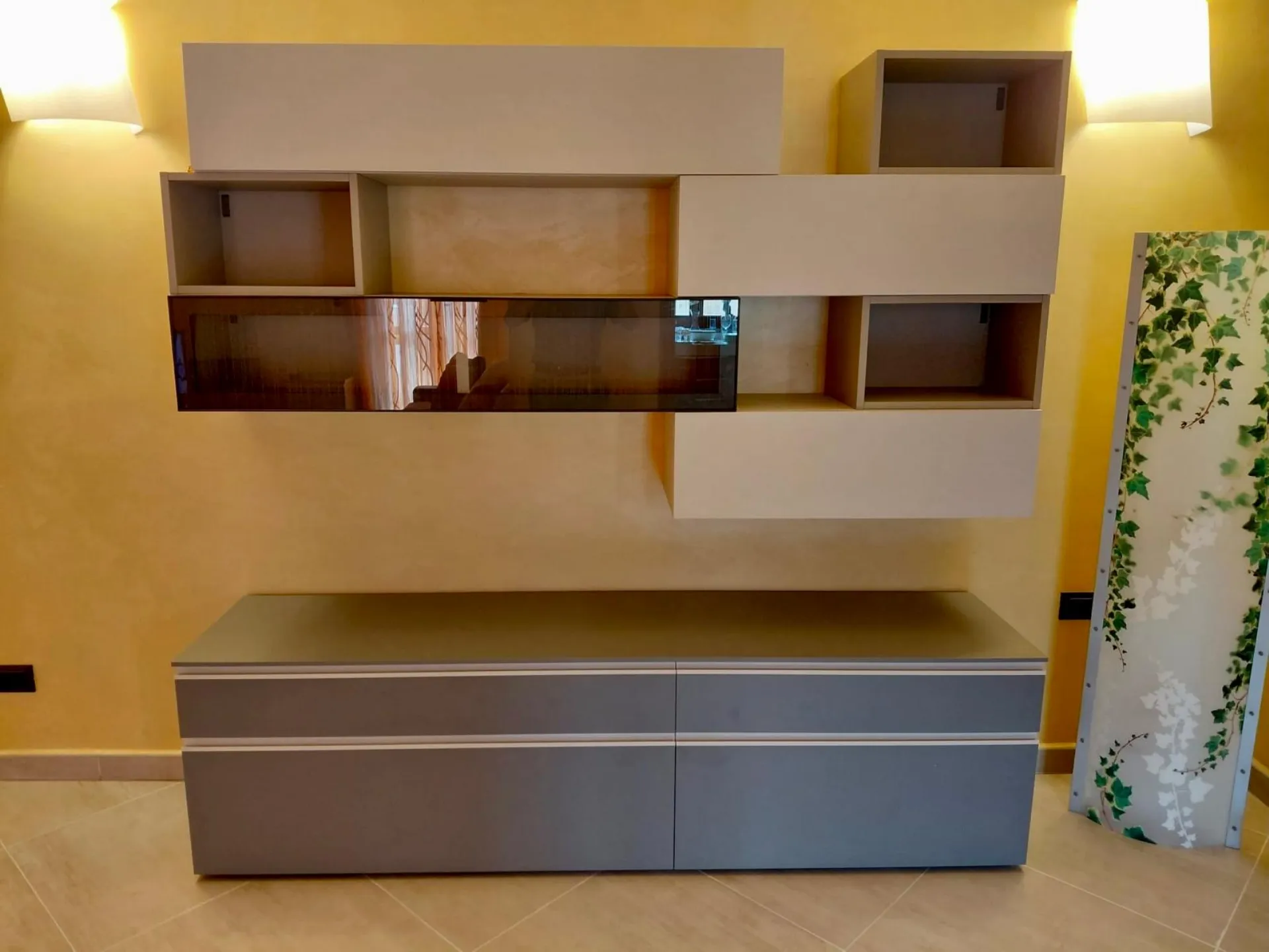Composizione soggiorno in tinta seta e platino con basi a terrra e pensili sospesi